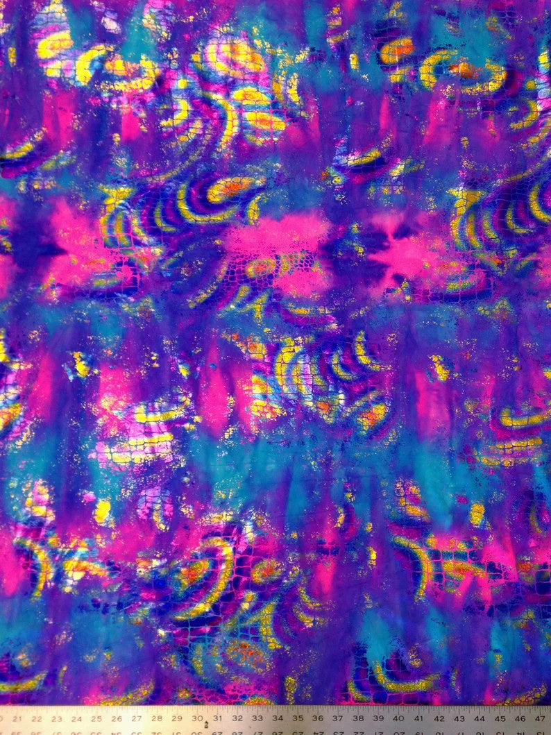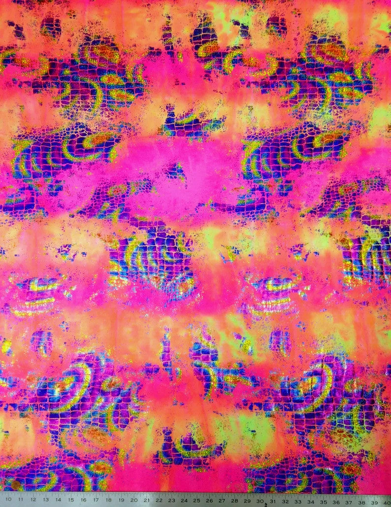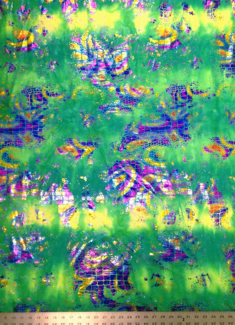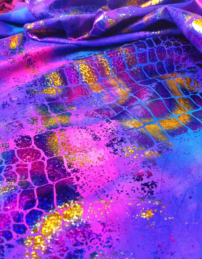 Holographic Shiny Foil Big Reptile Tie Dye Pattern on Bright Stretch Crease Nylon Spandex